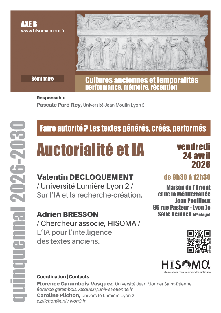 [HISOMA] - Séminaire « Faire autorité ? Les textes générés, créés, performés - Auctorialité et IA »Axe B « Cultures anciennes et temporalités : performance, mémoire, réception »