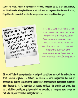 Spécialiste de droit comparé et du droit britannique, Aurélien travaille à l’explication de la vie politique au Royaume-Uni (la Constitution, l’équilibre des pouvoirs), et fait la comparaison avec le système français.