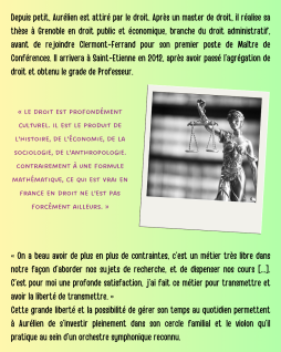 Arrivé en faculté de droit avec l’intention de devenir avocat, Aurélien est marqué par un professeur d’Histoire du Droit, qui lui donne envie de faire ce métier.