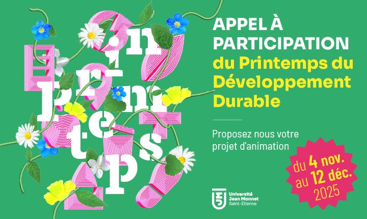 A travers ce dispositif, le souhait est à la fois de sensibiliser la communauté universitaire aux enjeux environnementaux actuels, mais aussi de mettre en lumière vos nombreuses initiatives autour du développement durable. C’est pourquoi nous vous sollicitons, étudiants, associations, composantes, personnels, sur tous les campus de Saint-Étienne et de Roanne, pour prendre part à cet évènement ludique et participatif.