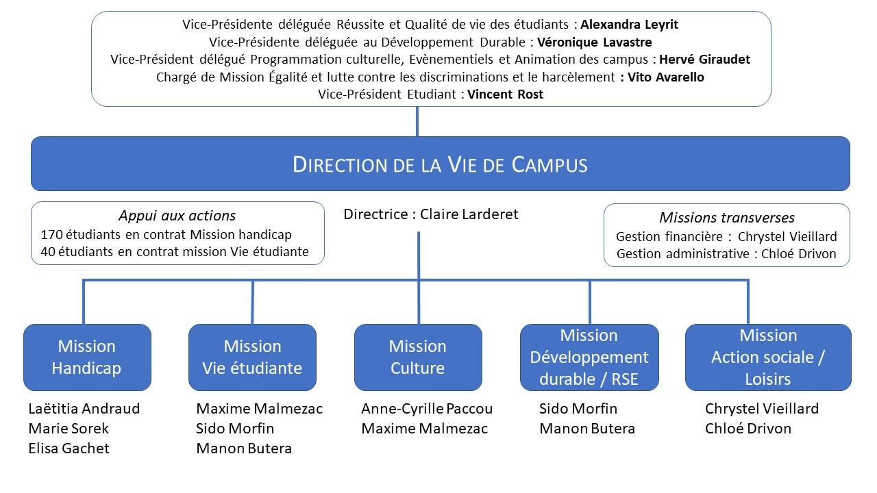 La Direction de la Vie de Campus, en lien avec l’équipe présidentielle de l’Université, développe des actions en faveur des étudiants et personnels de l'Université dans le but de contribuer à la qualité de vie et au bien-être, créer du lien social, favoriser l’accueil et l’inclusion, dans une démarche de responsabilité sociétale.